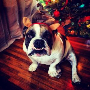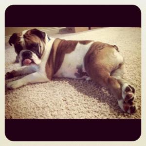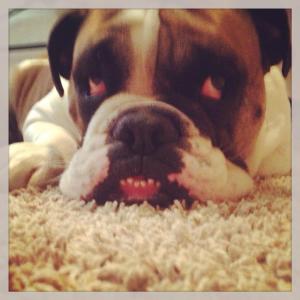 If you know me at all, then you probably know Sergis P. [pronounced: sərj-iz pē]. He’s our six-year-old, 80-pound English Bulldog who is sitting beside me, currently staring at the ceiling, licking the air.